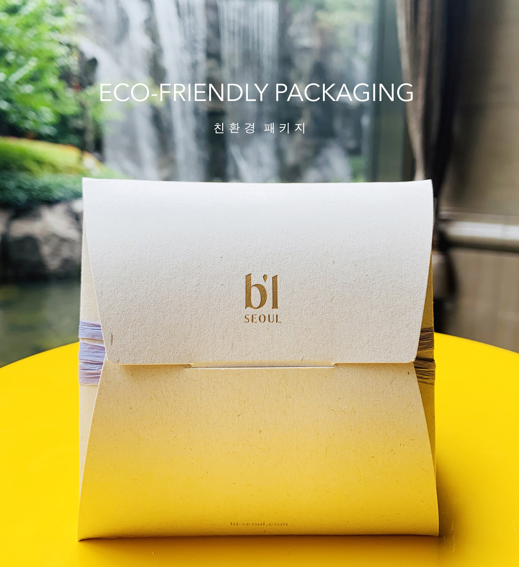 bi서울은 지속가능성(Sustainability)을 생각합니다.제품의 패키징은 100% 생분해되는 사탕수수로 만든'얼스팩(Earthpack)'을 사용하여 환경 파괴없이 지속될 수 있는 디자인을 추구합니다. 택배박스 또한 친환경 날개박스로,테이프대신 사용되는 친환경 핫멜트 접착제는 아이스크림 콘을 싸는 종이를 붙이는데 쓰이는인체에 무해한 접착제입니다.